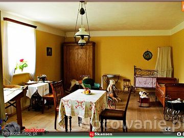 🏳️..Kaszubski Park Etnograficzny🏞️ im.Teodory i Izydora Gulgowskich - Wdzydze Kiszewskie. 🚩....dwór z Luzina 🖊️...duży pokój dziecięcy znajduje się w tzw. tylnym trakcie dworku. W pokoju dziecięcym spotykali się na co dzień wszyscy domownicy i sąsiedzi. Wyposażenie tego pokoju to:meble dziecięce i starsze ,wiejskie sprzęty. Ciekawe jest tu metalowe łóżeczko z baldachimem pokryte imitacją brązu. Oprócz niego jest jeszcze drugie wykonane z drewna jesionowego. Ciekawym sprzętem jest również ławeczka do odrabiania zadań domowych(na zdjęciu widoczna częściowo,po lewej stronie,przysłaniają ją delikatnie drzwi-nie widać siedzenia na którym zasiadał odrabiający lekcje zadane do domu). Pozostałe meble są zebrane w domu;różne krzesła ,stół,stara jednodrzwiowa szafa i ciekawe dziecięce zabawki.Pod oknem ustawiona maszyna do szycia marki „Singer” ....Niewidoczna na zdjęciu,jest tu jeszcze ławka z bocznymi poręczami ustawiona pod piecem... zdj.7