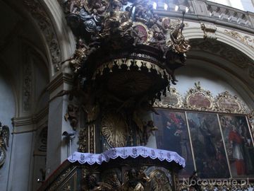 ambona - ubogacona rzeźbami czterech ewangelistów, zachwyca też baldachim oraz architektura wnętrza świątyni.