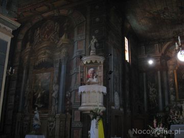 Ambona na dolew lewo od ambony figura Matki Boskej wcześnie w tym miejscu stała figura św. Antoniego zakupiona przez Ojca autora w 1927r w Częstochowie