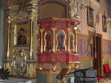 ambona z XVII wieku, nad nią baldachim a centralnie w nim przedstawiona gołębica, symbolizująca Ducha Świętego, który "'ma baczenie" na treści z ambony głoszone a winny być one "nasycone" tym, co w widocznych tablicach z dekalogiem, które Mojżesz otrzymał od Boga.