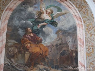 „Anioł zwiastujący św. Józefowi tajemnicę macierzyństwa Maryi” - na ścianie po lewej. Obrazy przedstawiają smutki i radości św. Józefa - wschodzące słońce oświe (Krzeszów)