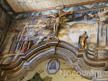 belka tęczowa - ale - ale : tu największy podziw budzi misterna dekoracja ściany i tu będąca perfekcyjnym połączeniem malarstwa i rzeźby - a mianowicie: na ścianie w żywych kolorach ukazana jest panorama Jerozolimy, po lewej żołnierz na koniu, przebija on włócznią bok Chrystusa - sama postać jest malowana, zaś ! - dłoń oraz włócznia - rzeźbiona, anioł podaje kielich.