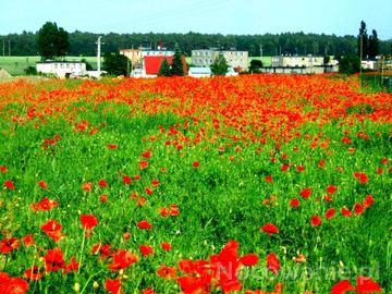 Bloki widoczne z dalszej części, przez pole na którym rosną maki (Barcin)