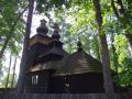 bramka główna do cerkwi - kamienne słupy bramne kryte gontowymi daszkami namiotowymi, przy progu po prawej kropielnica kamienna z misą - też nakryta stylowym daszkiem i zwieńczona krzyżykiem, jest na innym zdjęciu.