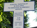 bryła kościoła od strony prezbiterium, w cieniu wiekowych drzew - wspominane są tysiącletnie dęby o obwodzie nawet 8 /osiem/ metrów. Wieniec tych drzew towarzyszył tej świątyni i wcześniejszych drewnianych, gdy próchniały i było zagrożenie upadających konarów na wiernych, to były wycinane a ich drewno na opał plebani, ale był też ksiądz co "troszczył się o nie jak o kwiaty".