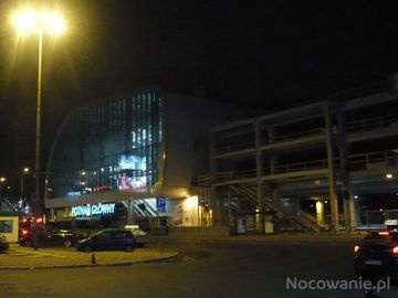 Bryła nowego dworca PKP widziany od strony starego dworca PKP wieczorem.