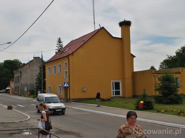 Budynek Urzędu Gminy w Barcianach. Czy zamieszkujący na kominie bociany mają wpływ na dzietność... (Barciany)