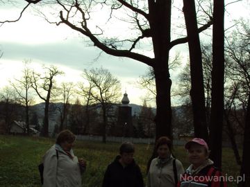 burza nadciąga, niebo coraz silniej zachmurzone - my nadal przebywamy w parku pałacowym - tu z widokiem na zabytkowy kościółek. (Średnia Wieś)