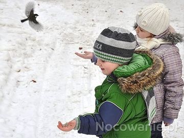Busko-Zdrój, Ania i Antoś karmią sikorki w parku uzdrowiskowym.