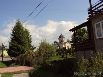 cerkiew - bryła w stylu bizantyjskiego soboru, jedyna taka w okolicy, dziś kościół.