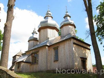 cerkiew - drewniana, konstrukcji zrębowej, trójdzielna o kwadratowych członach, oszalowana, na wzniesieniu, otoczona murem z kamienia.