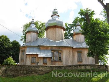 cerkiew - nad prezbiterium i babińcem ośmioboczne wieżyczki na sygnaturki, kryte baniastymi hełmami z pozornymi latarniami, pobite blachą, nad nawą w tym stylu wieża główna z kopułą.