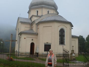 cerkiew, na planie krzyża greckiego, obok cmentarz wyznawców trzech religii - grekokatolickiej, prawosławia i rzymskokatolików, za bramką pomnik nagrobny kamienny zwieńczony krzyżem - tu pochowany fundator cerkwi dr Aleksander Wajcowicz - więcej przy innych opisach - warto ! Dalej - we mgle Wzgórze Horodyszcze - 429m npm, tam teraz "niedźwiedzie piwo ważą" - mgły poetycko...
