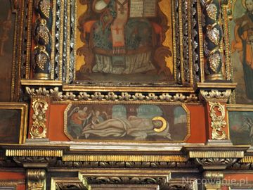 Chrystus Pantokrator - ikona namiestna, poniżej : "Złożenie do grobu" i niżej "Ostatnia Wieczerza" - w centralnej części ściany ikonostasu.