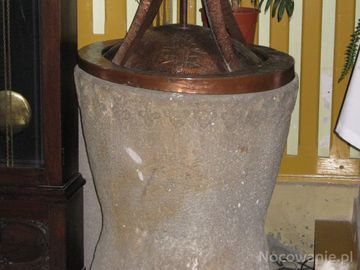 Chrzcielnica późnogotycka, koniec XV wieku, kamienna, w kształcie kielicha z arkadami i ornamentami w kształcie trójliści.