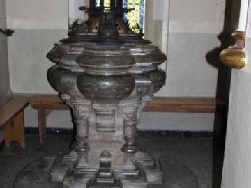 chrzcielnica w kościele - zabytkowa, wyjątkowo cenna, kunsztowne nakrycie kielicha.