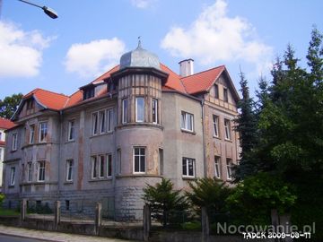 Ciekawe rozwiązanie w budownictwie miejskim - poddasze i narożna baszta konstrukcja drewnianych bali z wypełnieniem. Ulica Górników - K.Miarki. (Bolesławiec)