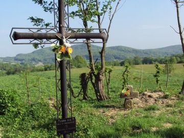 cmentarzyk choleryczny, tam archaiczny krzyż kamienny, miejsce niedawno odkrzaczone, oddane dla kultu i turystyki oraz badaczy dziejów. (Falejówka)