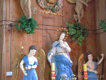 Część wyposażenia kościoła pochodzi z innych świątyń /były objęte pożarami, lub zdewastowane, w ruinie itp/ i tak Matka Boska Niepokalanie Poczęta z aniołkami (Rozpucie)