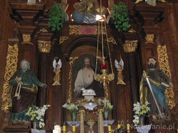 Część wyposażenia kościoła pochodzi z innych świątyń /były objęte pożarami, lub zdewastowane, w ruinie itp/ i tak tabernakulum ze wsi Mrzygłód /jest galeria - (Rozpucie)