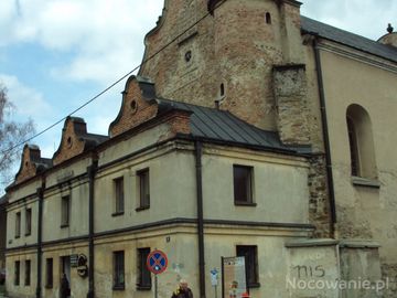 Dawna synagoga żydowska w stylu manierycznym z pocz. XVII stulecia. Napis na zewnętrznej elewacji ściany zachodniej: MA NORA HAMAKOM HAZE, EJN ZE KI IMBET ELOHI (Lesko)