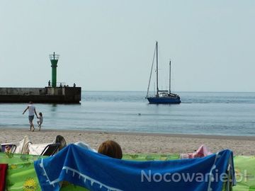 Do portu w Mrzeżynie zawijają różne jednostki pływające,a ich obserwowanie umila czas opalania. (Mrzeżyno)