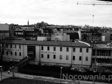Dom handlowy Wokulski nad rzeką Białą, z prawej str kawałek budowy kolejnego centrum handlowego Sfera2, w dalszym planie wieża kosciała Ewangelickiego oraz dach (Bielsko-Biała)