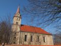 Droga przez miejscowość z widoczna na II planie wieża kościoła (Wawrzyszów)