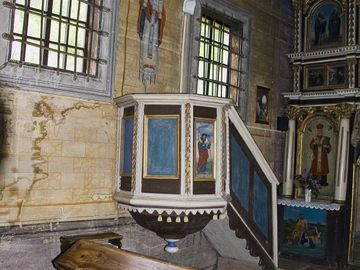 Dubne. Cerkiew greckokatolicka pw. św. Michała Archanioła z 1863 r. Ambona.