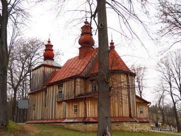 dziś - i od dziesięcioleci - świątynia wraz z wyposażeniem służy sprawowaniu liturgii obrządku rzymsko-katolickiego, do czasu przesiedleń tj. do 1947r. wiernymi byli wyznawcy obrządku grecko-katolickiego i im służyła cerkiew - tu : widok od drogi, cmentarz jest grzebalny, po lewej : współczesna - 2015r. - metalowa konstrukcja dzwonnicy, z dwuspadowym daszkiem.