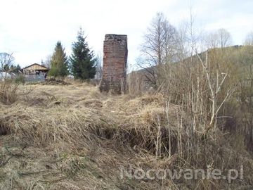 dzwonnica przy kościele ewangelickim. Zachowały się czytelne ślady murów kościoła - na tym zdjęciu wyjątkowo dobrze widoczne - oraz kamienne płyty i krzyże nagrobne.