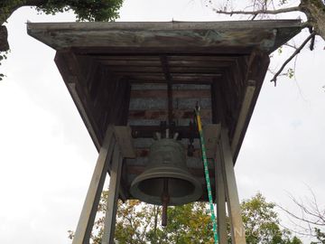 dzwonnica przy kościele, współczesna, na stelażu / konstrukcji metalowej - dzwon daszkiem nakryty.