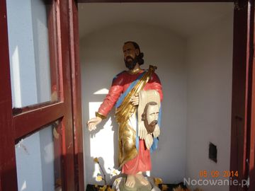 figura przedstawiająca św. Bartłomieja Apostoła - w niszy przydrożnej kaplicy, na przegubie lewej ręki przełożona jest "człowiecza skóra wraz ze skórą zdartą z (Górki)