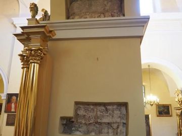 filar kościelny - a w "jego strukturze" - odkrywanie dziejów, tu badacze dotarli do surowych kamiennych ciosów.