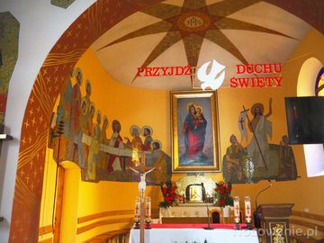 filialny kościół rzymskokatolicki - n/z prezbiterium z bogatą ścienną polichromią i ołtarz. W 1981r. utworzono tu łacińską parafię pw. Matki Bożej Nieustającej Pomocy.