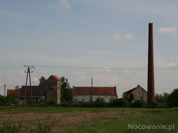 Fragment zabudowy wsi oraz komin po nie istniejącej już Garbarni w G.Dolnej (Golanka Dolna)