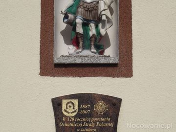 fronton remizy strażackiej - tam : tablica w intencji oraz w niszy rzeźba przedstawiająca św. Floriana z cebrzykiem z wodą - patron m.in strażaków. (Jaćmierz)