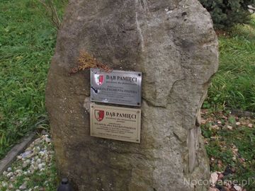 głaz / obelisk z tablicami upamiętniającymi akt posadzenia "dębów pamięci" - przy miejscowej szkole.