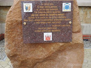 głaz a na nim tablica z tekstem honorującym rocznice, świątynię i jej odnowienie w Jubileuszowym Roku Miłosierdzia - przy murach kościoła.