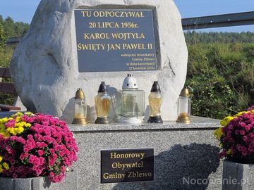 Głaz z tablicą pamiątkową pobytu w tym miejscu Karola Wojtyły w 1956 r.