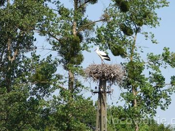 Gniazdo bociana przy drodze nad zalew.