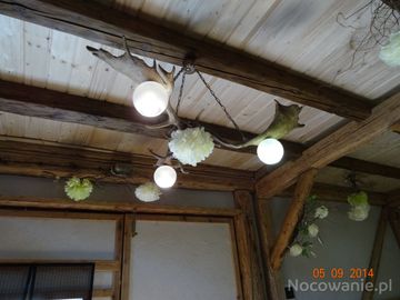 gospodarstwo agroturystyczne - infrastruktura ubogacająca ofertę pobytu, tu : wnętrze / powała i żyrandol w jadalni, a tam są też schody po których trzeba wejść (Górki)