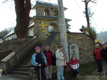 grupa z UTW z Sanoka na zdjęciu: przy schodach do kościoła /byłej cerkwi/ przez dzwonnicę bramną parawanową - prowadzących. (Zwierzyń)