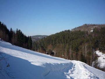 Harbutowice.Droga do "Cisów Raciborskiego" Chodników.Po prawej Kijowa Góra,w głębi domy "U Pomnika"obok Przełęczy Sanguszki.