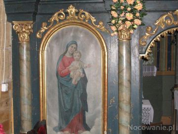 Ikonostas z 1908r., architektoniczny, carskie wrota - ażurowe, z motywem winnej latorośli i dwunastoma tondami z wizerunkami proroków. (Hołuczków)