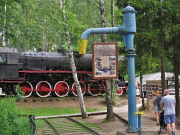 Inne ujęcie lokomotywa i stacji pomp dla parowozów (Szymbark)
