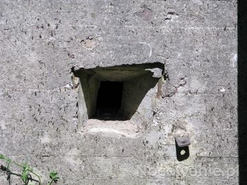 Jeden z dwóch otworów strzelniczych stanowiska obrony wejścia do Schronu nr 2. w Dobieszewku. Na prawo widoczna metalowa sztaba zamykająca drzwi, bądż kratę pancerną chroniącą wejście do obiektu. Drzwi niestety nie zachowały się do naszych czasów... (robo