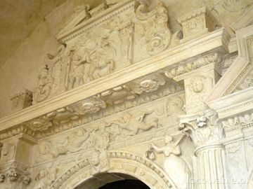Jedna z najpiękniejszych rezydencji pałacowych w Polsce. Położona 10 km na południe od Przemyśla. Zamek - pałac powstał w XVI wieku. Przez kolejne lata rozbudowywany i upiększany . Należał do początków XIX wieku do Krasickich. W latach 30-ch XIX wieku kupiony przez Sapiehów i w dalszym ciągu rozbudowywany i upiększany. Sapiehowie wprowadzili zwyczaj sadzenia w pałacowym parku dębu z okazji narodzin syna , i lipy z okazji narodzin córki . Stąd w parku wspaniałe okazy lip i dębów . W tym zamku urodził się / i ma swój wspaniały dąb z pamiątkowym kamieniem / - legendarny Książę Kardynał - Adam Stefan Sapieha - metropolita Krakowa od 1911 do 1951 roku. " Odkrywca " , protektor i przewodnik Karola Wojtyły . Leżący na prawym brzegu Sanu / tuż przy brzegu / , znalazł się w 1939 roku po stronie Związku Radzieckiego / San był granicą pomiędzy Niemcami a Związkiem Radzieckim - pakt Ribentrow Mołotow /. Stacjonujące w zamku - pałacu oddziały wojsk Radzieckich / jacyś podobno Azjaci - przez pełne dwa tygodnie palili na dziedzińcu wielkie ognisko z antycznych mebli , książek , wystroju pałacu , obrazów - bezcennych dzieł sztuki . Spalono wtedy bezcenne , wielowiekowe zbiory sztuki , antyków , obrazów , starych ksiąg itp. Rozbili kompletnie i zbezcześcili grobowce rodzinne Sapiehów w Baszcie w poszukiwaniu kosztowności. Po wojnie Pałac stał się siedzibą Technikum Leśnictwa. Następnie , zdewastowany , kompletnie zniszczony Zamek - Pałac - przejęła Agencja Rozwoju i Modernizacji Przemysłu i powoli przywraca do dawnej świetności tą perłę Polskich rezydencji magnackich. Obecnie z Pałacu mieści się luksusowy hotel , restauracja oraz odbywają się koncerty , imprezy kulturalne itp. Wokół zamku - Pałacu rozciąga się przepiękny park ze wspaniałymi okazami drzew. Tak wspaniałych dekoracji baszt , ścian , wnętrz nie ma nigdzie więcej . Cudone miejsce. Wszystko dostępne dla turystów. Na zdjęciu dekoracje nad wejściem do kaplicy zamkowej.