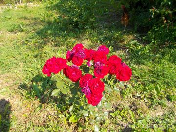 Jesienne róże szczególnie dla Teresy .Na dalszym planie kura z tzw.wolnego wybiegu.Ciekawe czy kura zna unijną dyrektywę :" kury w klatkach mają stać pazurami do przodu" :-)