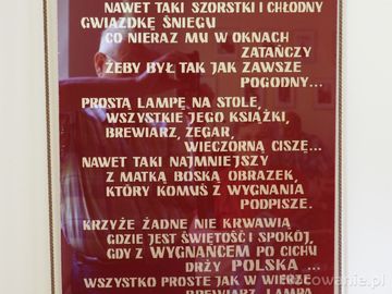 jesteśmy w salce katechetycznej - oddanej niedawno wiernym i pątnikom, urządzonej w starych folwarcznych obiektach zespołu klasztornego - tu niegdyś były stajnie i spichlerze, dziś siostra zakonna tu zgromadzonym będzie mówić o czasach internowania ks. prymasa Wyszyńskiego. Na ścianie salki prezentowana makata z wierszem autorstwa ks. Jana Twardowskiego.